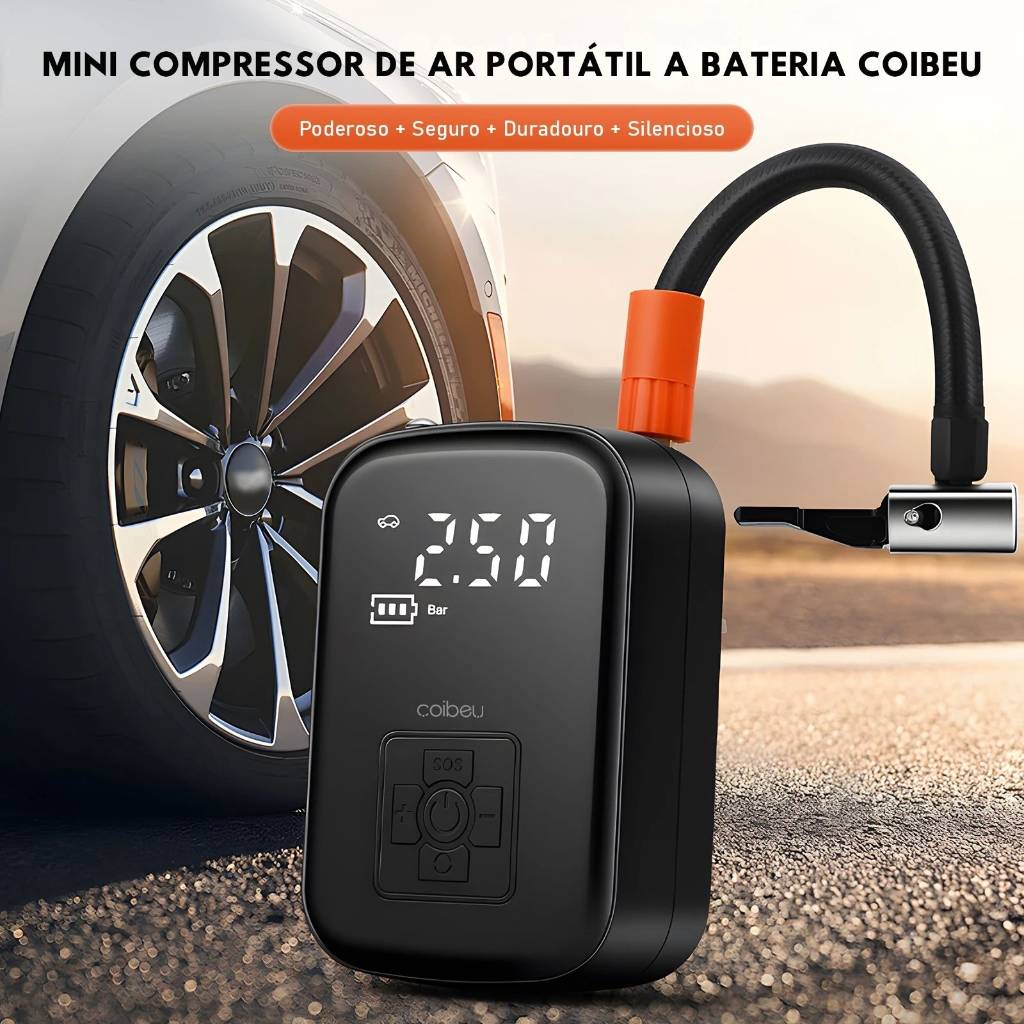 IMAGINA VOCÊ ESTAR NUMA ESTRADA ISOLADA QUE NÃO TENHA NADA POR PERTO E SEU PNEU MURCHA OU FURA? SERIA RUIM DE MAIS NÉ? ENTÃO NOSSO MINI COMPRESSOR DE AR PORTÁTIL A BATERIA COIBEU PODE TE SALVAR NESSES MOMENTOS!